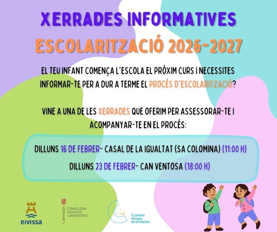 Aquestes xerrades estan obertes a totes les famílies que vulguin escolaritzar als seus fills i filles als centres educatius públics i concertats del municipi d’Eivissa per al curs 2026-2027, on s'explicarà en què consisteix aquest procés i es donaran indicacions de com fer-ho. Posteriorment, s’obrirà un espai de preguntes i respostes en cas que hagin quedat dubtes per part de les famílies.