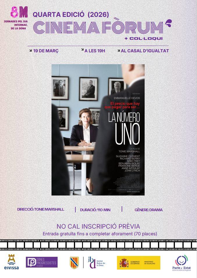 La reflexió i el debat també tindran un paper destacat amb el cinefòrum organitzat per Dones Progressistes el dijous 19 de març al Casal d’Igualtat, amb la projecció de ‘La número 1’ i posterior col·loqui, així com la projecció del documental ‘Veus pròpies. Quan elles parlen’, dirigit per Ferran Gassiot, el divendres 20 de març, en una activitat organitzada conjuntament amb el Consell Insular d’Eivissa.