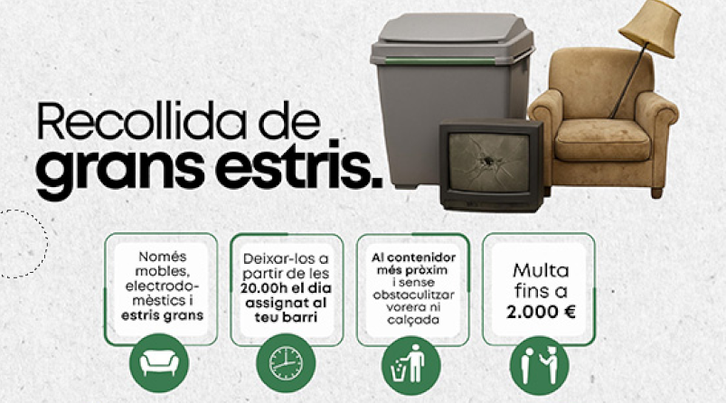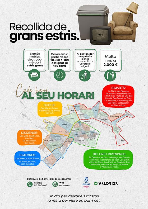 L’incompliment d’aquesta normativa pot comportar sancions de fins a 2.000 euros. Els residus voluminosos (mobles, electrodomèstics i altres estris de gran mida) s’hauran de dipositar a partir de les 20.00 hores del dia assignat a cada barri, sempre al costat del contenidor més proper però sense impedir la recollida regular. Per a més informació o consultes, la ciutadania pot contactar amb el Departament de Medi Ambient de l’Ajuntament d’Eivissa al telèfon 971 39 76 00.