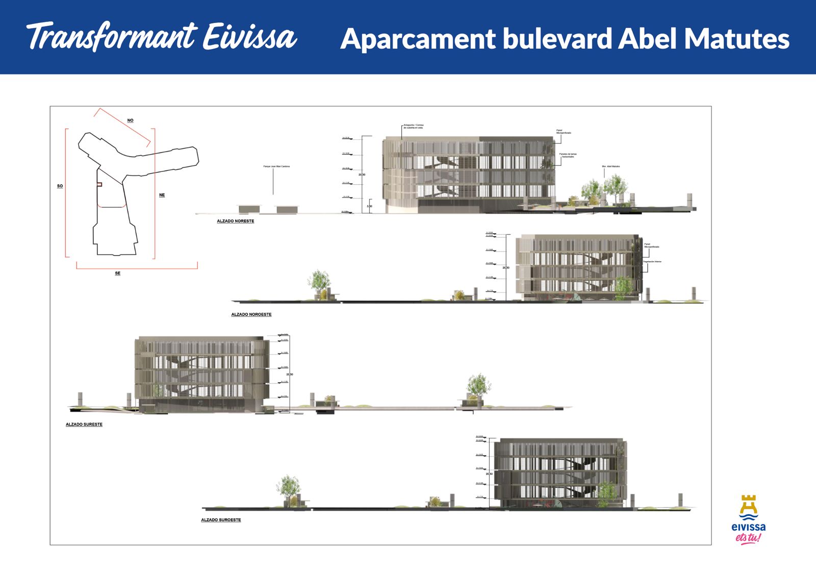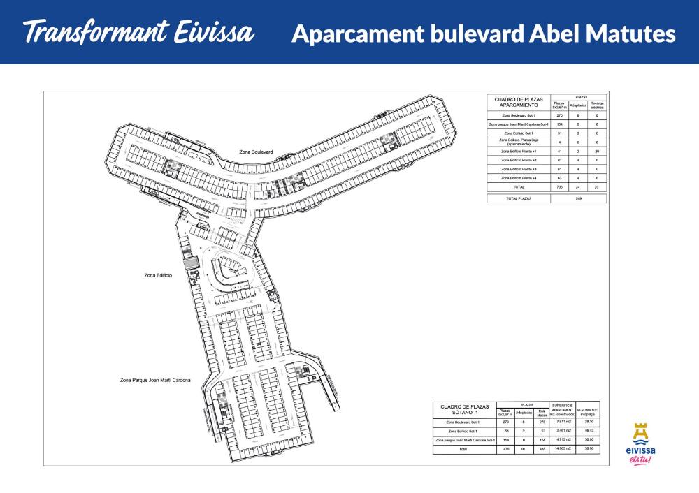 El alcalde de Eivissa Rafael Triguero ha presentado hoy, junto con la regidora de obras Blanca Hernández, los detalles del anteproyecto del futuro aparcamiento del bulevard Abel Matutes. Se tratará de un aparcamiento con una planta subterránea y cuatro más en superficie, que ocupará la zona del actual bulevard Abel Matutes y las parcelas colindantes situadas en c/ del Bisbe Abad i Lasierra, c/ de Fra Vicent Nicolau i c/ de Josep Zornoza Bernabeu. En total se prevé una superficie de 25.845m2, y la creación de 749 plazas de aparcamiento, de las cuales 485 serán subterráneas y 264 en superficie. Además, el edificio contará con cinco locales comerciales en planta baja cuyas superficies irán desde los 102 a los 811m2.
