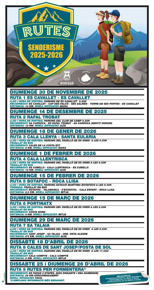Sobre les rutes de Senderisme 2025-2026, que començaran el 30 de novembre, l’objectiu de l’Ajuntament d’Eivissa amb aquesta iniciativa és oferir a la ciutadania una forma de “redescobrir Eivissa pas a pas” En total, s’han programat nou itineraris que permeten gaudir del paisatge, la natura i el patrimoni de l’illa. La programació completa és la següent: